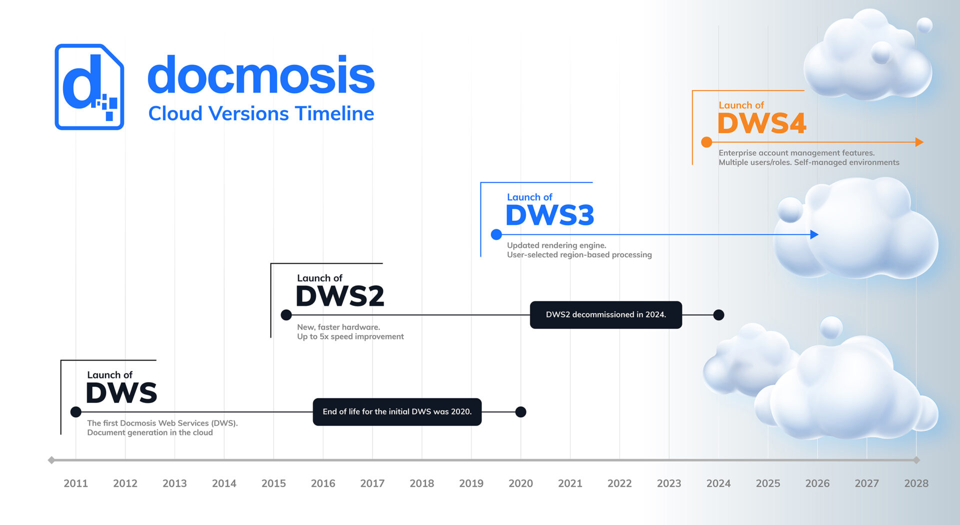 The Cloud service was first launched in 2011 as Docmosis Web Services (DWS).